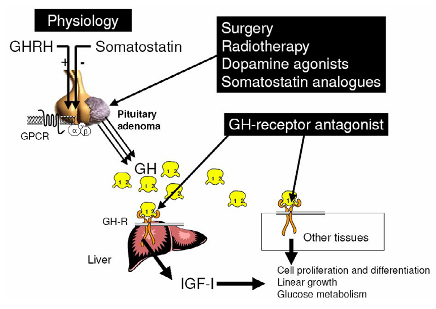 또한 GH와 인슐린유사성장인자-1(insuline-like growth hormone, IGF-1)은 음성 피드백 기전을 통해 시상하부와 뇌하수체에 작용하여 GHRH 분비를 감소시키고 소마토스타틴 분비를 증가시킴으로써 GH 분비를 조절한다(Figure 1).