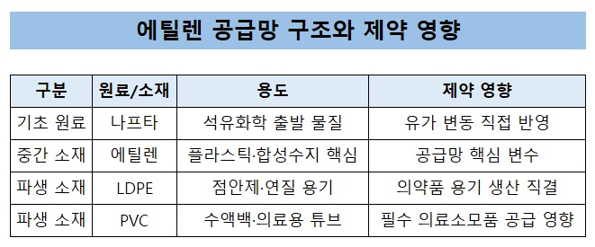 제약업계 역시 영향권에 들어섰다는 평가다. 특히 석유화학 기초 원료인 ‘에틸렌’을 중심으로 공급망 불안 가능성이 부각되면서 의약품 생산 기반 전반에 긴장감이 높아지고 있다.