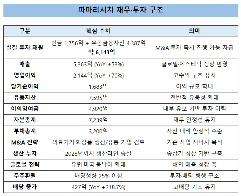 업계 관계자는 "파마리서치는 현금창출력을 기반으로 투자와 배당을 동시에 확대하는 구조를 구축했다. 6000억원대 유동성을 바탕으로 한 M&A 추진과 글로벌 확장이 맞물리며 외형 성장 속도가 한층 빨라질 수 있다"고 분석했다.