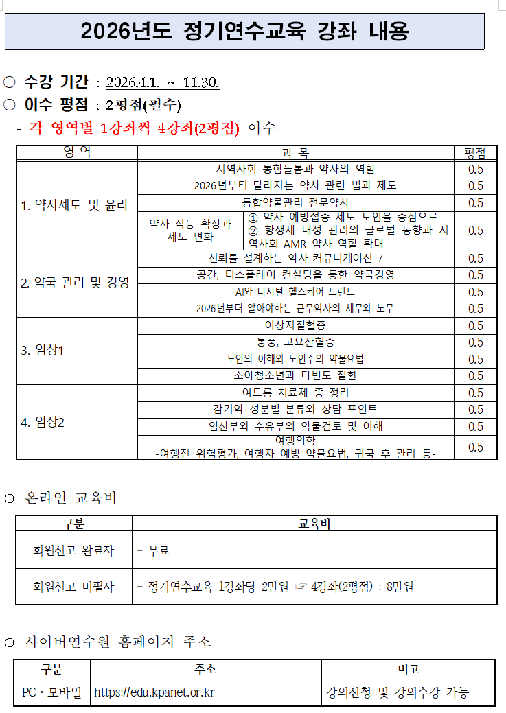 약사회에 따르면 약국 개설·근무약사 중 올해 6개월 이상 근무할 경우 사이버연수원을 통해 이번 2026년도 정기연수교육 2평점을 반드시 이수해야 한다.