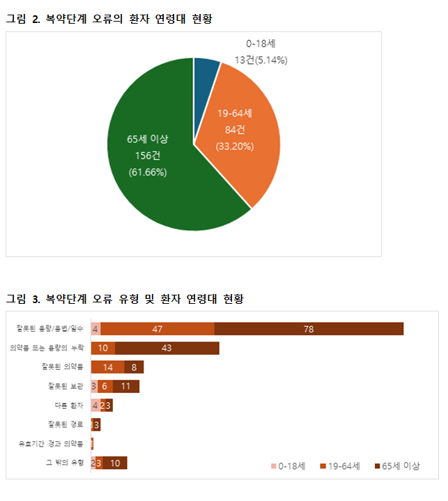 복약단계 사고는 전체 253건 중 과반이 넘는 156건(61.7%)이 65세 이상 노인 환자에게서 발생됐다는게 센터 설명이다. 특히 '잘못된 용량/용법/일수' 유형의 복약오류 129건 중 가장많은 78건(60.5%)이 65세 이상 노인환자인 것으로 조사됐다.