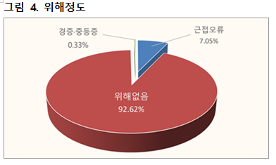 전체 보고 건의 위해 정도를 분석한 결과 '위해 없음'이 13,724건(92.6%)으로 대부분을 차지했고, '근접오류' 1045건(7.1%), '경증' 47건(0.32%), '중등증' 2건(0.01%) 등이었다. 위해 발생을 최소화한 것은 약사의 선제적 오류 발견과 중재 역할에 따른 것으로 분석됐다.