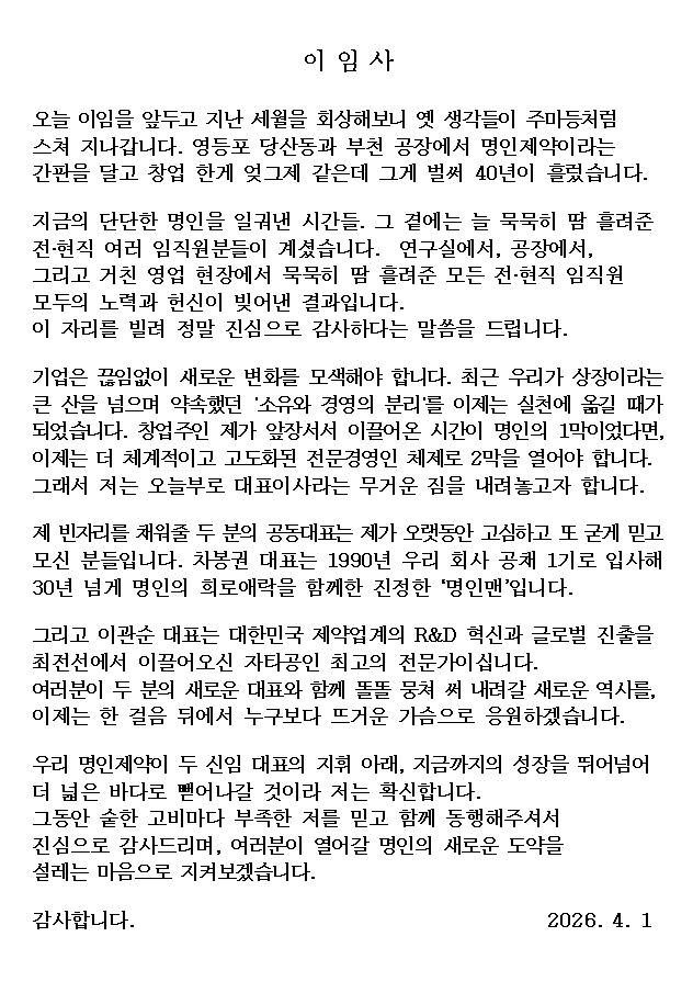 [데일리팜=이석준 기자] 이행명 명인제약 회장이 대표이사 자리에서 물러난다. 창업 이후 40년간 회사를 이끌어온 오너 경영을 내려놓고 전문경영 체제로 전환한다.