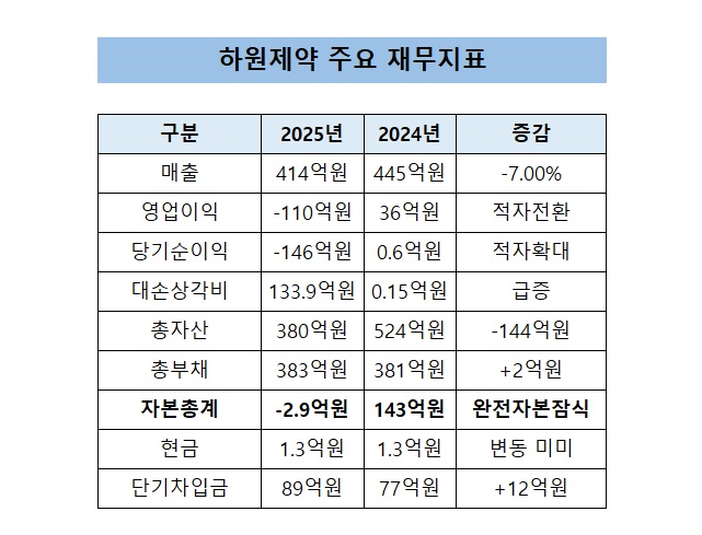 재무제표에 따르면 하원제약의 2025년 매출은 414억원으로 전년(445억원) 대비 감소했다. 매출원가는 336억원으로 줄었지만 판매비와관리비가 189억원으로 전년(54억원)에서 증가했다. 이에 영업이익은 36억원 흑자에서 110억원 손실로 전환됐다. 당기순손실은 146억원이다.