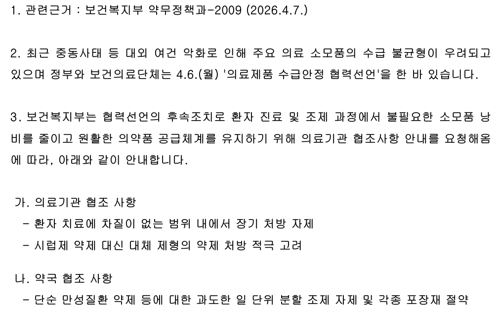 보건복지부 역시 6일 12개 의약단체 협력선언의 후속조치로 환자 진료 및 조제 과정에서 불필요한 소모품 낭비를 줄이고 원활한 의약품 공급체계를 유지하기 위해 ▲환자 치료에 차질이 없는 범위 내에서 장기 처방 자제 ▲시럽제 약제 대신 대체 제형의 약제 처방 적극 고려 ▲단순 만성질환 약제 등에 대한 과도한 일 단위 분할 조제 자제 및 각종 포장재 절약 등을 의료기관과 약국에 요청했다.