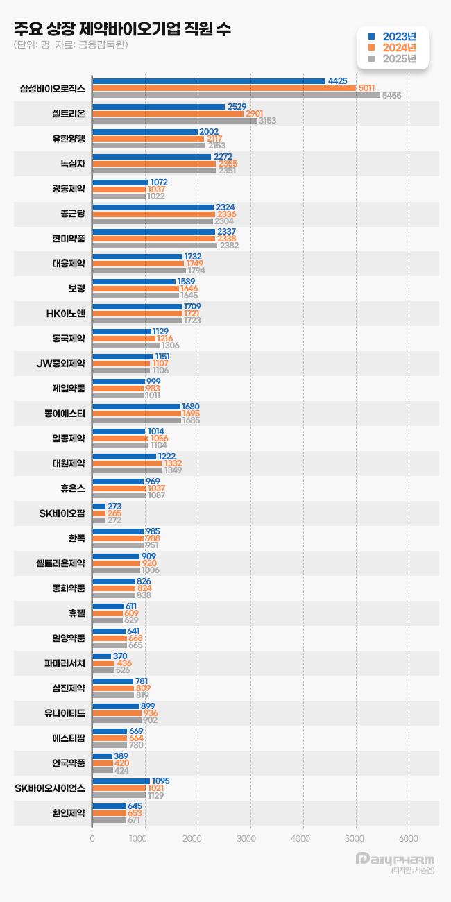 삼성바이오로직스는 작년 말 기준 직원 수가 5455명으로 1년 전보다 444명 늘었다. 삼성바이오로직스는 지난 2024년 제약바이오기업 중 처음으로 직원 수가 5000명을 넘어선 데 이어 인력을 추가로 확충했다.
