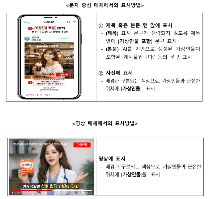 블로그·인터넷 카페 등 문자 매체의 경우 게시물의 제목이나 첫 부분에 'AI를 기반으로 생성된 가상인물이 포함된 게시물입니다' 또는 '가상인물 포함' 등의 문구를 기재해야 한다.