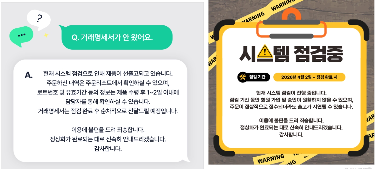 일례로 현대약품 자사몰에는 시스템 점검 안내가 게시된 상태로, 점검 기간 동안 주문 접수 및 출고 지연 가능성이 공지된 것으로 확인됐다. 거래명세서 역시 점검 완료 후 순차 전달 예정으로 안내됐다.