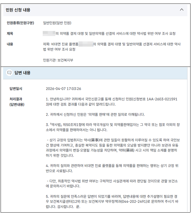 복지부는 민원에 대한 답변에서 “약사법 제50조 제1항에 따라 약국 외 장소에서 의약품을 판매하는 행위는 금지되며, 비대면 진료 플랫폼을 통해 의약품을 판매하는 행위는 해당 규정 위반으로 사료된다”고 밝혔다.