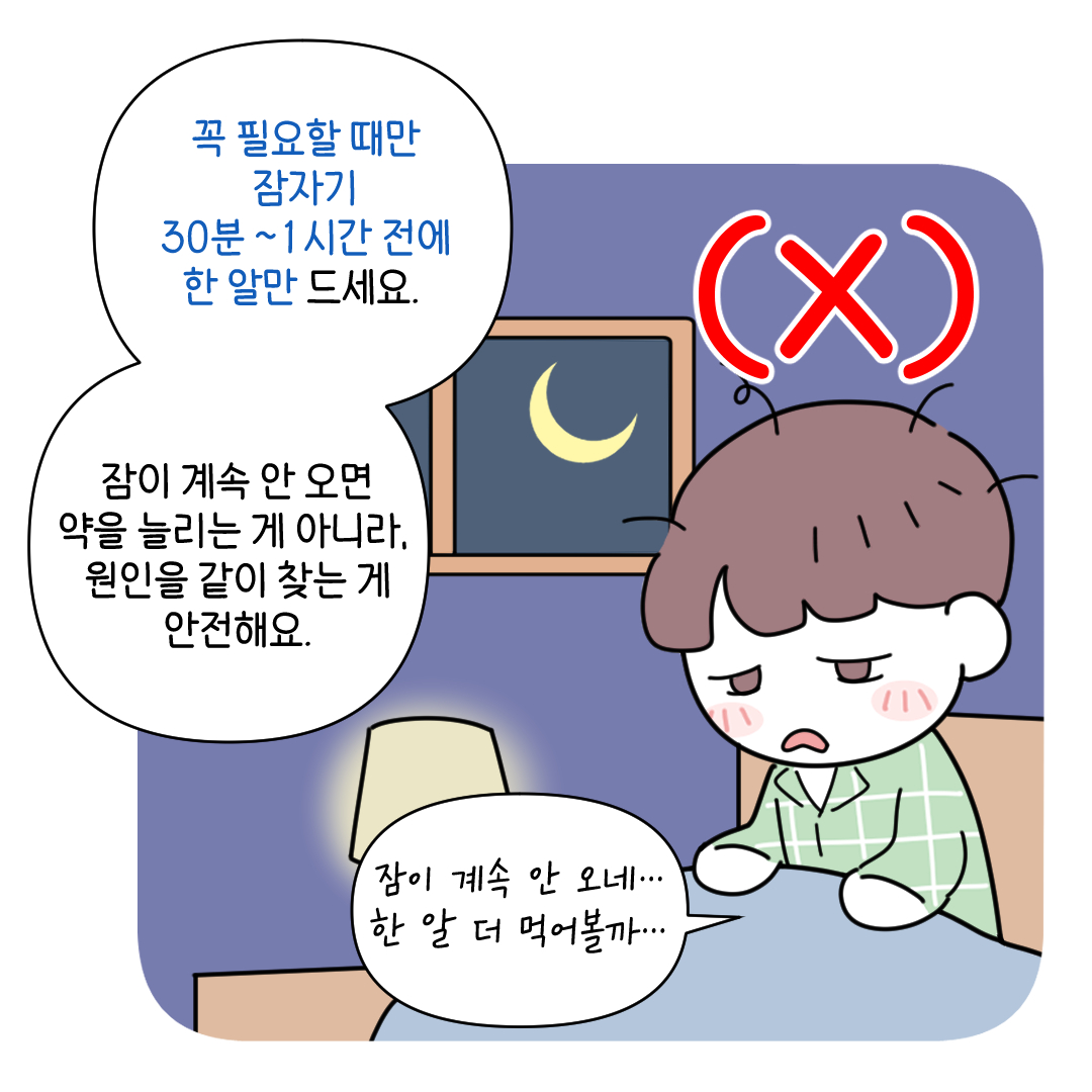 약사: 꼭 필요할 때만 잠자기 30분 ~ 1시간 전에 한 알만 드세요. 잠이 계속 안 오면 약을 늘리는 게 아니라, 원인을 같이 찾는 게 안전해요.
