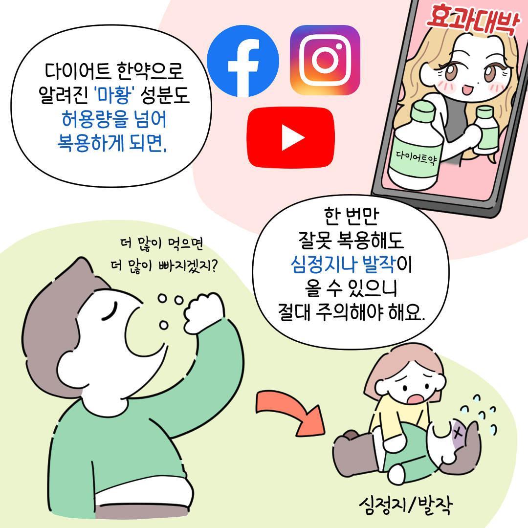 약사: 다이어트 한약으로 알려진 '마황' 성분도 허용량을 넘어 복용하게 되면, 한번만 잘못 복용해도 심정지나 발작이 올 수 있으니 절대 주의해야 해요.