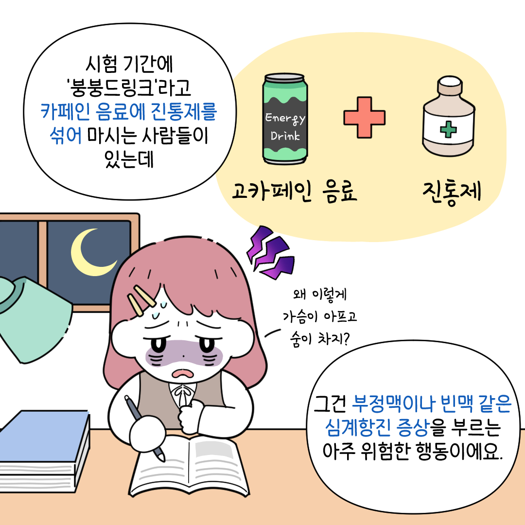 약사: 시험 기간에 '붕붕드링크'라고 카페인 음료에 진통제를 섞어 마시는 사람들이 있는데 그건 부정맥이나 빈맥 같은 심계항진 증상을 부르는 아주 위험한 행동이에요.