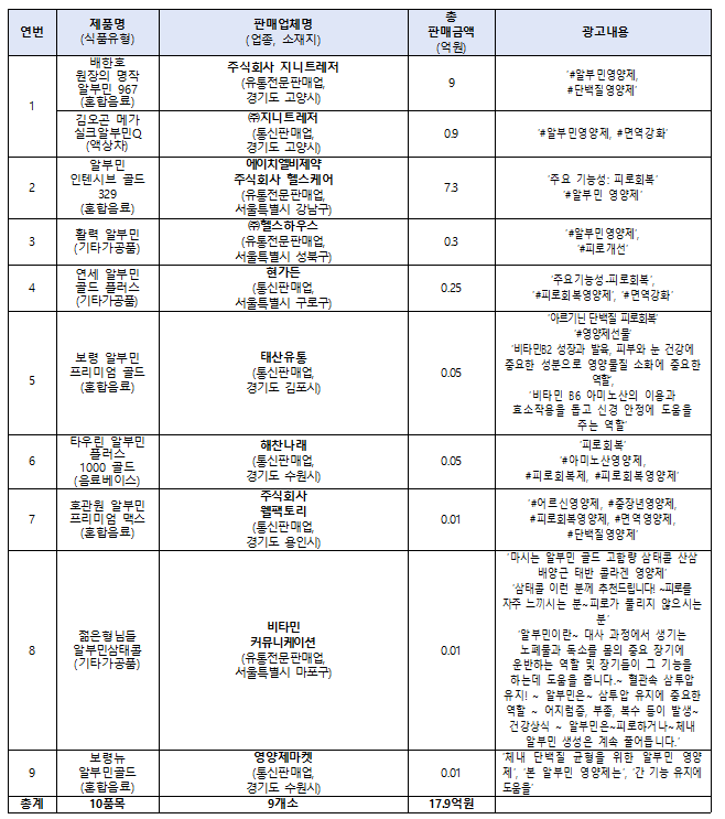 알부민 식품을 온라인 쇼핑몰 등에서 건강기능식품 등으로 오인하도록 부당광고한 9개 판매업소는 이를 통해 약 18억 원 상당을 판매한 것으로 나타났다. 식약처는 해당 판매업체를 식품표시광고법 위반으로 적발했다.