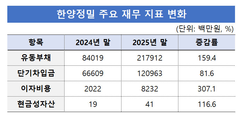 한양정밀 유동부채는 2024년 말 840억원에서 지난해 말 2179억원으로 2배 이상 불어났다. 단기차입금 증가세도 두드러진다. 같은 기간 한양정밀 단기차입금은 667억원에서 1210억원으로 급증했다. 회사가 주식 매수나 오너 대여금 재원을 마련하기 위해 외부에서 자금을 끌어다 쓰면서 부채가 급속도로 증가한 것이다.