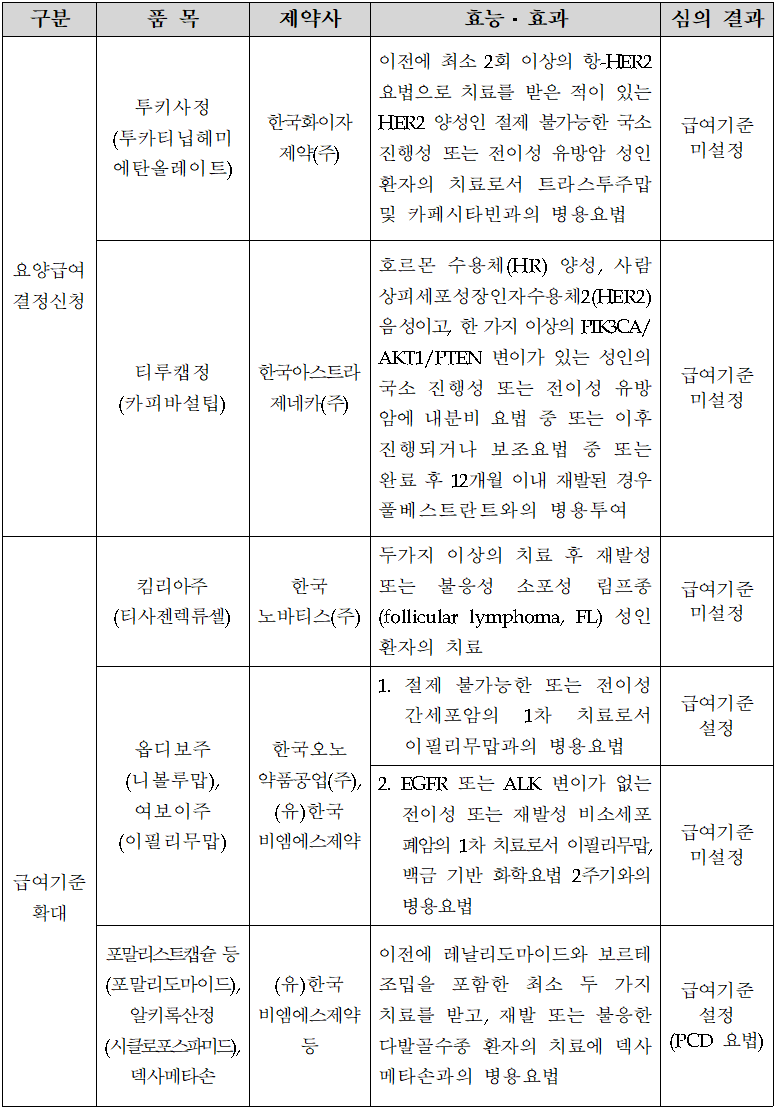 급여기준 확대에서는 면역항암제 병용요법의 결과가 엇갈렸다. 한국오노약품과 한국비엠에스가 신청한 옵디보주(니볼루맙)·여보이주(이필리무맙) 병용요법은 절제 불가능한 또는 전이성 간세포암의 1차 치료로서 급여 기준이 설정됐다.