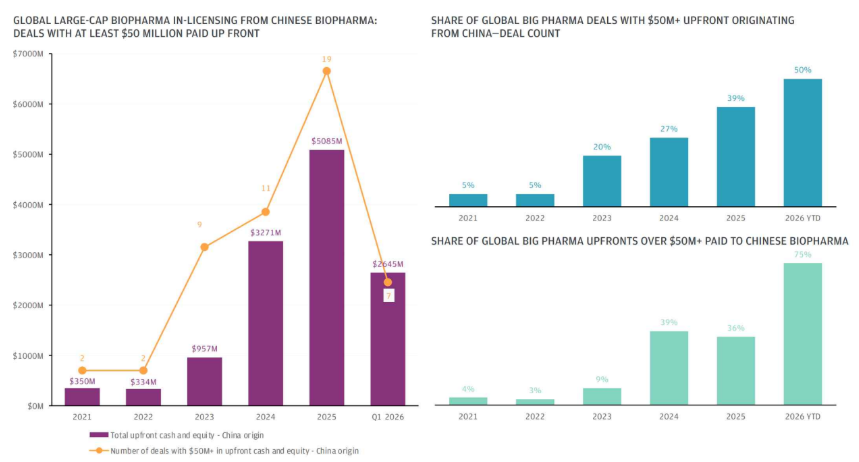 반면 라이선스 거래 측면에서는 중국의 부상이 압도적이다. 올 1분기 글로벌 빅파마들은 중국 바이오제약사로부터 자산을 적극적으로 확보했는데 선급금이 5000만 달러를 초과한 대형 거래 건수의 절반이 중국에서 유래한 자산이었다. 거래 금액 기준으로 보면 중국의 비중은 무려 75%(26억 달러)에 달했다.