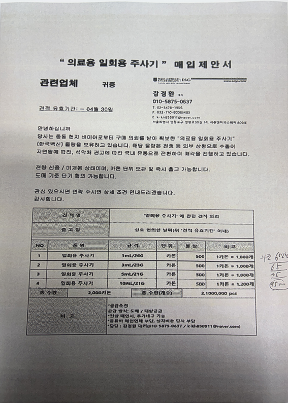 식약처는 “정부를 사칭한 주사기 구매 제안은 명백한 범죄에 해당할 수 있으므로 엄중히 조치하겠다고 밝히며 판매업체 등은 피해가 발생하지 않도록 각별히 유의해 달라”고 강조했다.
