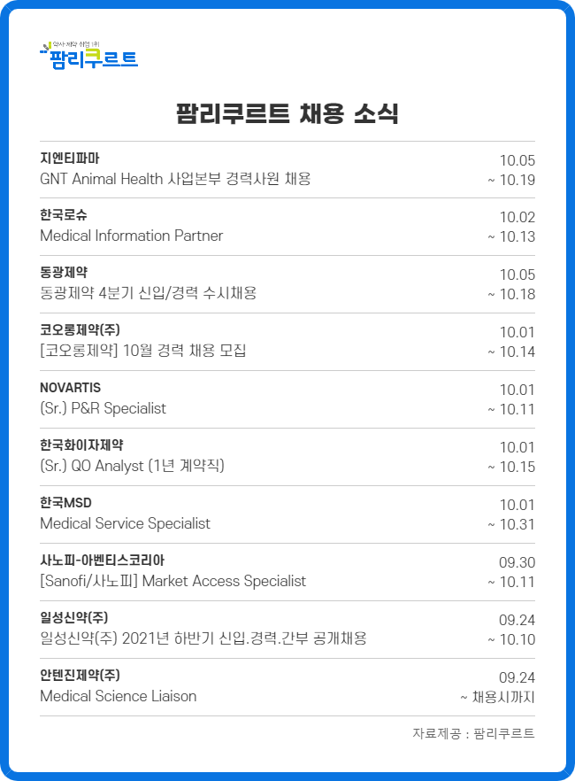 - [팜리쿠르트 10월 첫째주 채용정보 소식]