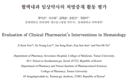 연세대 세브란스병원 약제부(유지선, 이소영, 김재송, 손은선)와 연세대 약학대학(유윤미)은 7일 발표된 병원약사회지 37권4호에 '혈액내과 임상약사의 처방 중재 활동 평가' 연구를 통해 임삼약사의 임상적 영향력을 평가하고, 향후 역할 증대에 필요한 근거를 마련했다.
