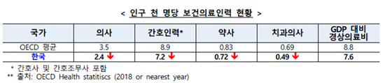 - 인구 천명당 의사 2.3명, 약사 0.72명, 간호사 3.59명...OECD 평균 미달