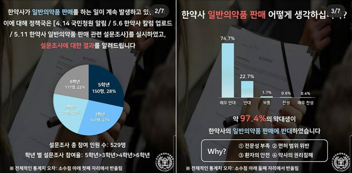 15일 전국약학대학학생협회(회장 송현규)는 공식 SNS 계정을 통해 지난 5월 11일 전국 약대생 대상으로 실시한 한약사의 일반약 판매 관련 설문조사 결과를 공개했다.