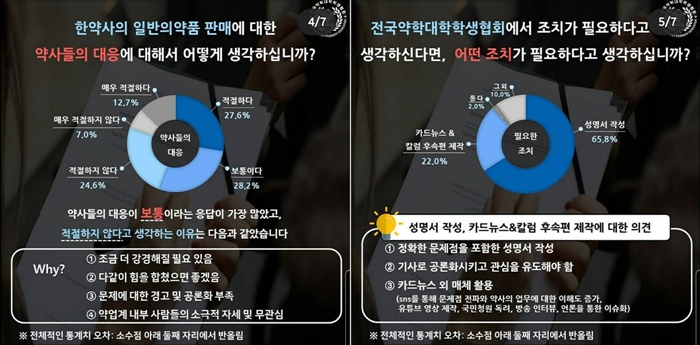 설문을 통해 약대생들은 한약사 일반약 문제를 공론화시켜 관심을 유도해야 한다고 봤다. 또한 SNS로 문제점을 알리고 약사 업무 이해를 높이는 한편 유튜브 영상 제작, 국민청원 독려, 방송 인터뷰, 언론 등 다양한 방식의 대응이 필요하다고 여겼다.