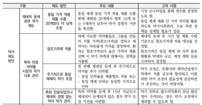그 방법으로 참조가격제를 제시했는데, 제네릭 의약품 등재 후 5년이 경과한 후로서 동일 제제(동일 성분, 동일함량, 동일 제형) 품목이 5개 이상 등재된 경우, 또는 시간에 관계없이 동일 제제 품목이 20개 이상 등재된 경우 해당 동일 제제 제품에 적용할 수 있다고 했다.
