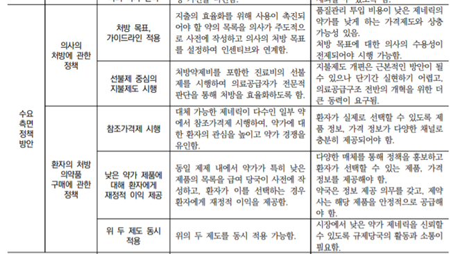 이를 위해 ▲의약품 처방 목표 또는 가이드라인 적용 ▲선불제 중심의 지불제도 시행 ▲환자의 처방 의약품 구매에 관한 정책 등을 언급했다.