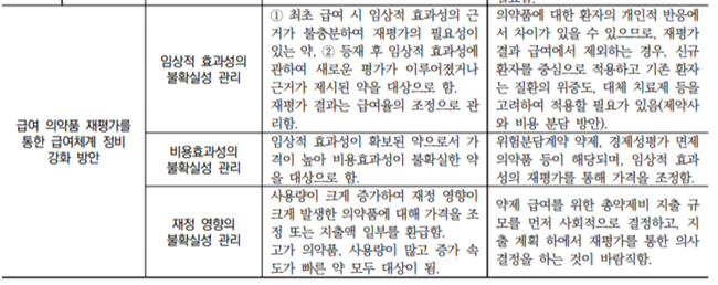 이들 약제의 경우 임상적 효과성을 재평가해 비용효과성이 인정되는 수준으로 가격을 조정할 수 있다.
