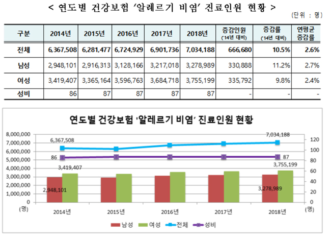 건강보험 가입자 중 알레르기 비염으로 요양기관을 방문한 진료인원이 703만여명에 달했다. 2014년 637만여명에서 10.5%(연평균 2.6%) 증가한 셈이다.