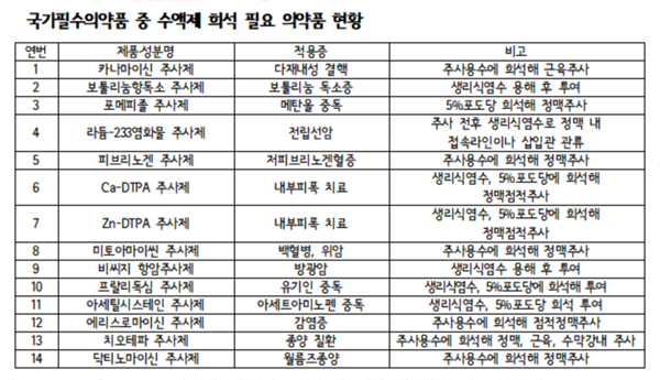 - 국가필수의약품 중 14개 기초수액제 없이 사용 불가