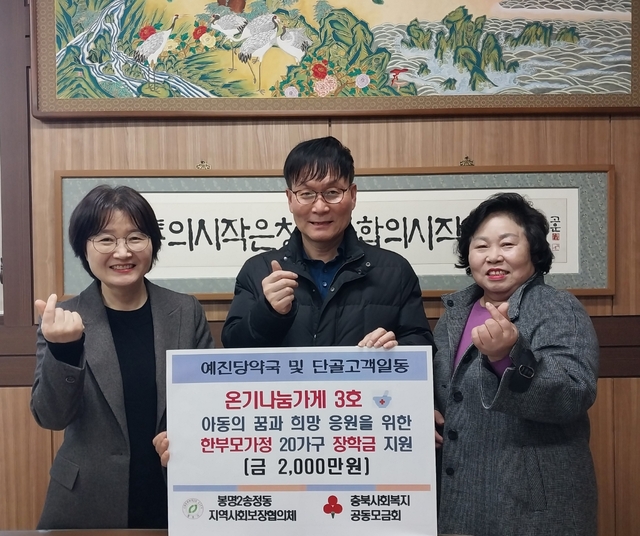 충북 청주 예진당약국(약사 박재억, 사진 가운데)은 25일 청주시 흥덕구 봉명2송정동 행정복지센에 지역 인재 육성을 위한 장학금 2000만원을 기탁했다. 이번 장학금은 지역내 한부모 가정 등 경제적으로 어려움을 겪는 취약계층 20가구 학생에게 10개월간 지원될 예정이다.
